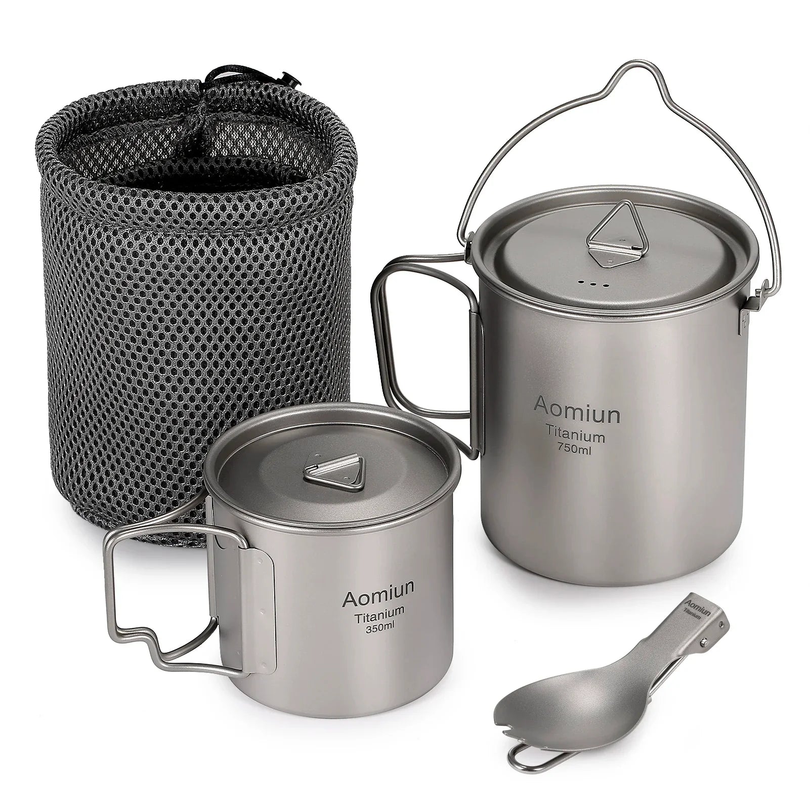 Enhance your outdoor adventures with this lightweight titanium 3-piece set. Perfect for camping enthusiasts, it includes a 750ml pot, a 450ml water cup with lid, and a folding spork, combining durability with convenience.